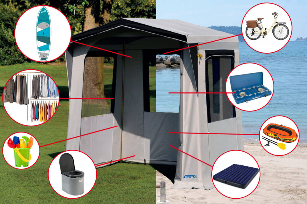 Quando invece lo spazio viene occupato da attrezzatura sportiva, dalle biciclette o dai giocattoli dei bambini ecco che il cucinotto da campeggio può trasformarsi in un egregio rimessaggio che, posto accanto alla tenda o al van permette una copertura dalle intemperie dei nostri beni ed anche una sicurezza in più se ci assentiamo o per la notte.