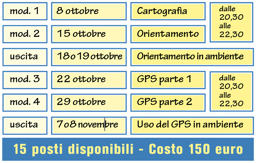 Sono previsti 4 moduli teorici con esercizi pratici di circa 2 ore cadauno che si terranno presso il reparto sportivo del negozio ERCOLE, e due moduli pratici in ambiente, il primo sabato 18 o domenica 19 ottobre per esercitarsi sull'orientamento e il secondo sabato 7 o domenica 8 novembre a fine lezioni teoriche.